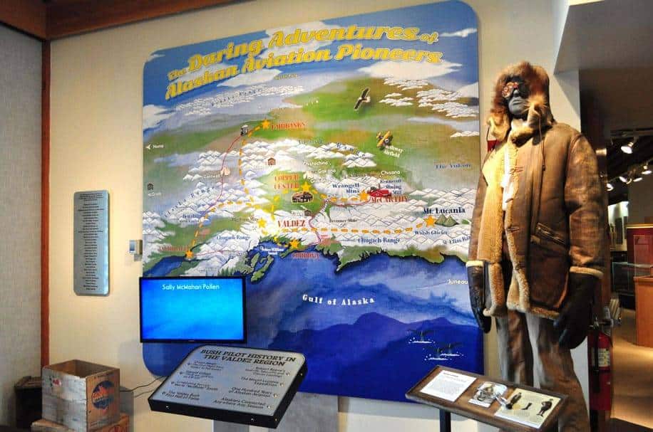 Air travel has long been an essential mode of transportation for Alaskan towns, and Valdez is no exception, being home to pioneer bush pilots such as Bob Reeve, Owen Meals, and Bill Egan. From the 1920s onward, aviators allowed remote communities sustained access to the outside world, and provided transport for miners, hunters, and others to previously-unreachable locations. Through the Valdez Museum’s interactive map, visitors will learn about the heyday of the Alaskan bush pilot as seen through the exiting stories of the pilots who made their name daring to do what no one else would. Learn about iconic aircraft such as the Alexander Eaglerock, Fairchild, Curtiss, and Aeronca. The story of aviation in Valdez from 1964 until today, emphasizing current airlines, the May Day Fly-In, and the significance of tourism to the area is also highlighted. The exhibit also features displays of the equipment indispensable to the Valdez flyboys, and a full-sized mannequin dressed as a bush pilot, decked out in the authentic gear worn by Owen Meals and Robert Campbell Reeve.