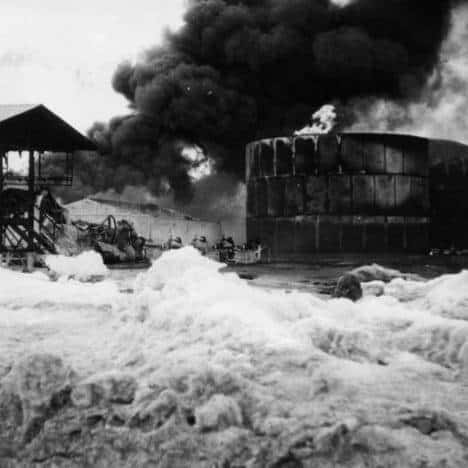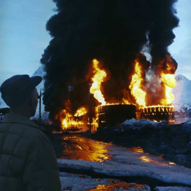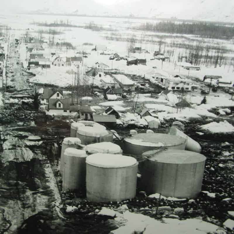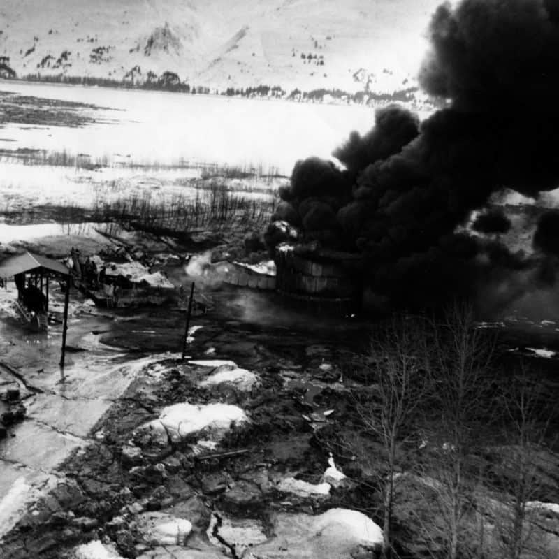 During the 1964 Earthquake oil from broken piping external to the Standard Oil tanks leached out into the water, ignited and floated, creating a dangerous fiery surface. The nearby Union Oil storage containers caught fire and later exploded. Smoke from the fires darkened the sky for days.
