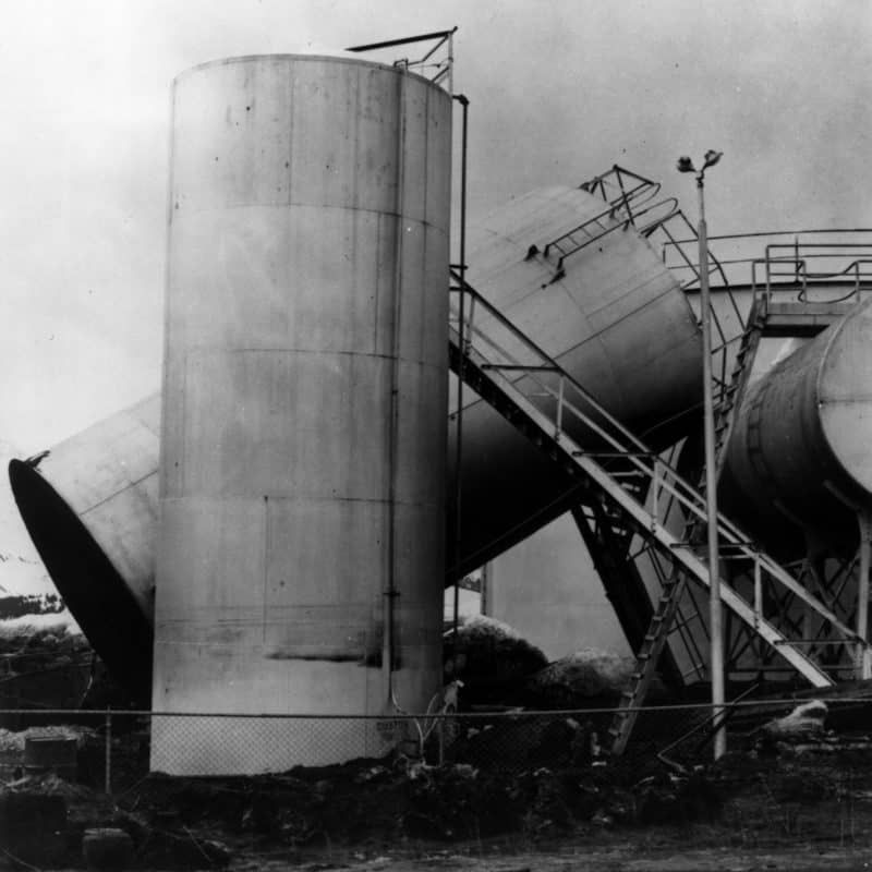 Union Oil’s steel riveted tanks stored gas and home fuel oil. Unlike the welded containers comprising the nearby Standard Oil Company yard, Union’s tanks ruptured during the 1964 Earthquake. Gasoline housed within, caught fire and burned first, creating space in the tanks that then filled with oxygen and combusted. All but one of the tanks exploded. The cause of the rupture goes unexplained, evidence obscured by the explosions and fires.
