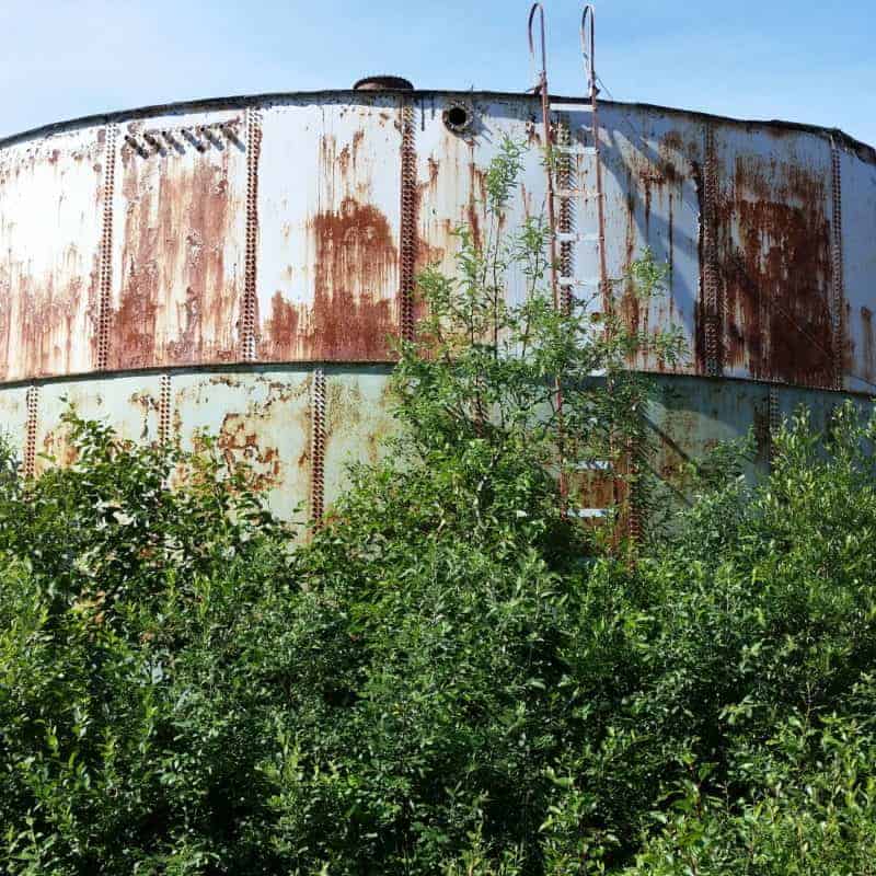 The surviving tank, now converted into a storage shed, sits at Mark’s Repair on the Richardson Highway near the eastern boundary of Old Town.