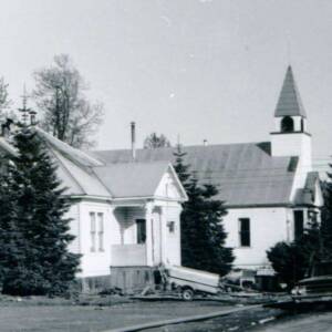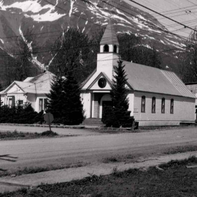 Associated with the Assemblies of God Church, the “chapel” ran a children’s home on the same block. Two tall Spruce trees remain from Old Town and flag the church’s entrance. The church’s bell located in a handsome tower, rang out on Sundays calling the local congregation to service. The church, itself, did not move to New Valdez, but the bell found a new home there.