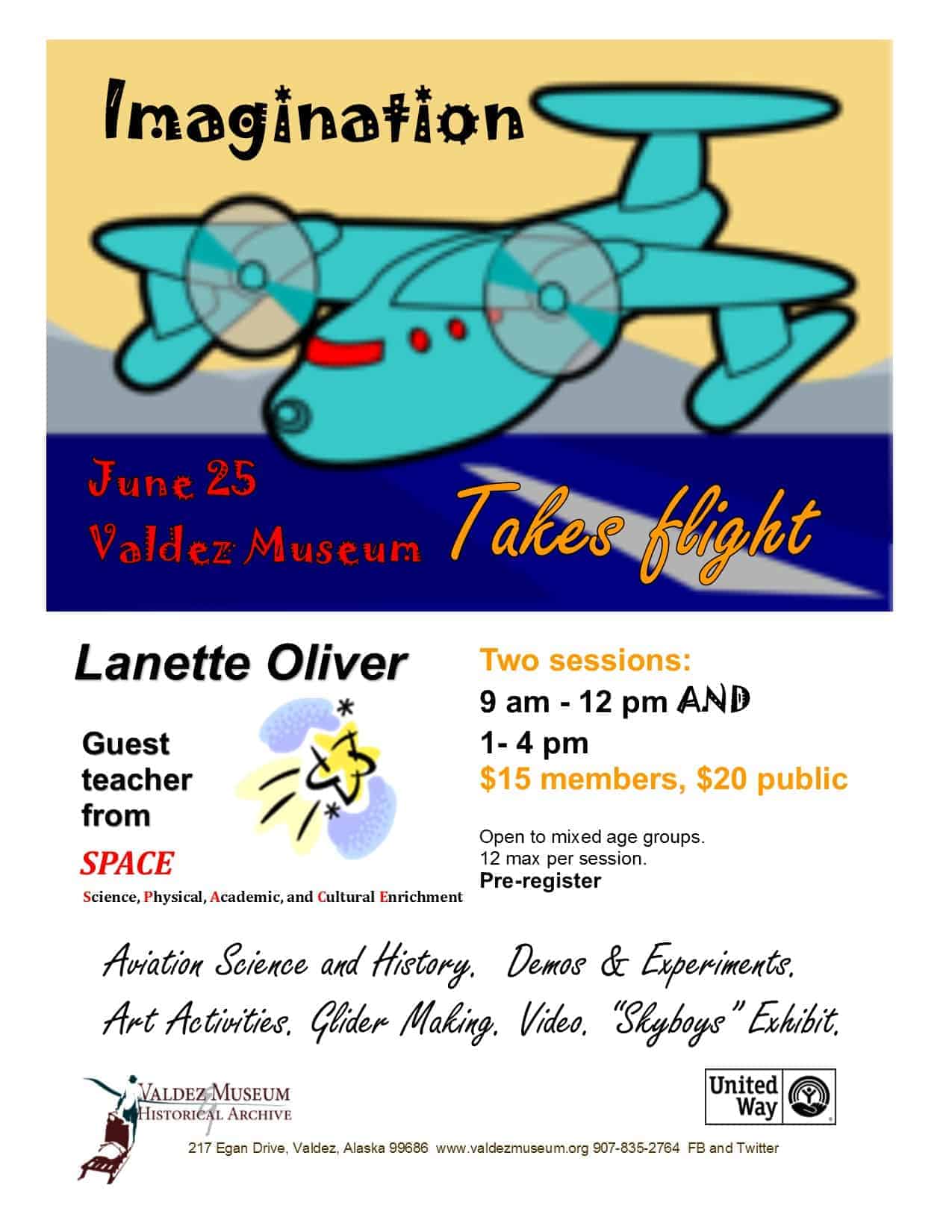 Imagination Takes Flight Workshop with Lannette Oliver. Two Sessions, morning and afternoon 9-12 and 1-4. Max 12 people per session. Sessions can be comprised of families and mixed age groups. History of flight. Exploration of Skyboys. Air-plane making and more!